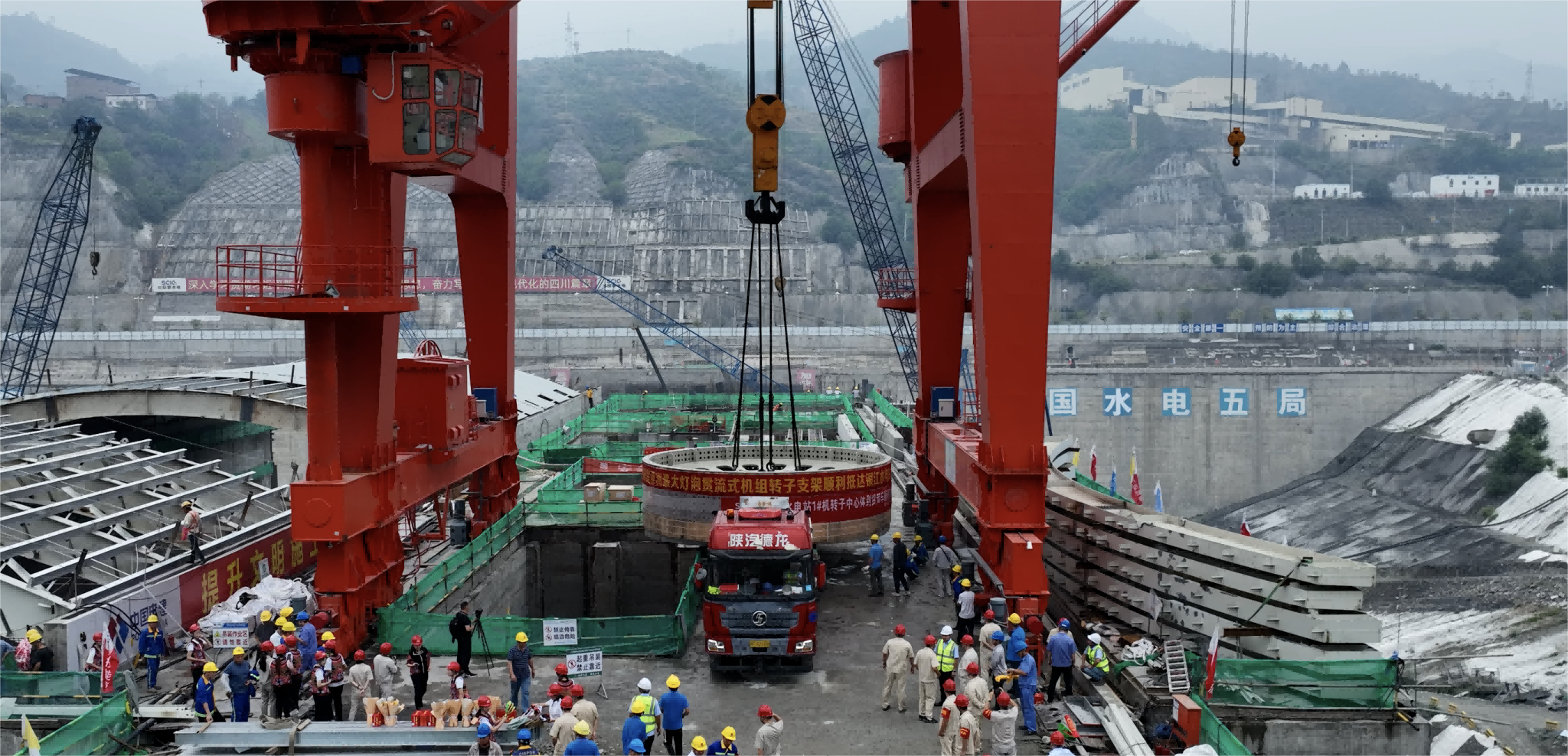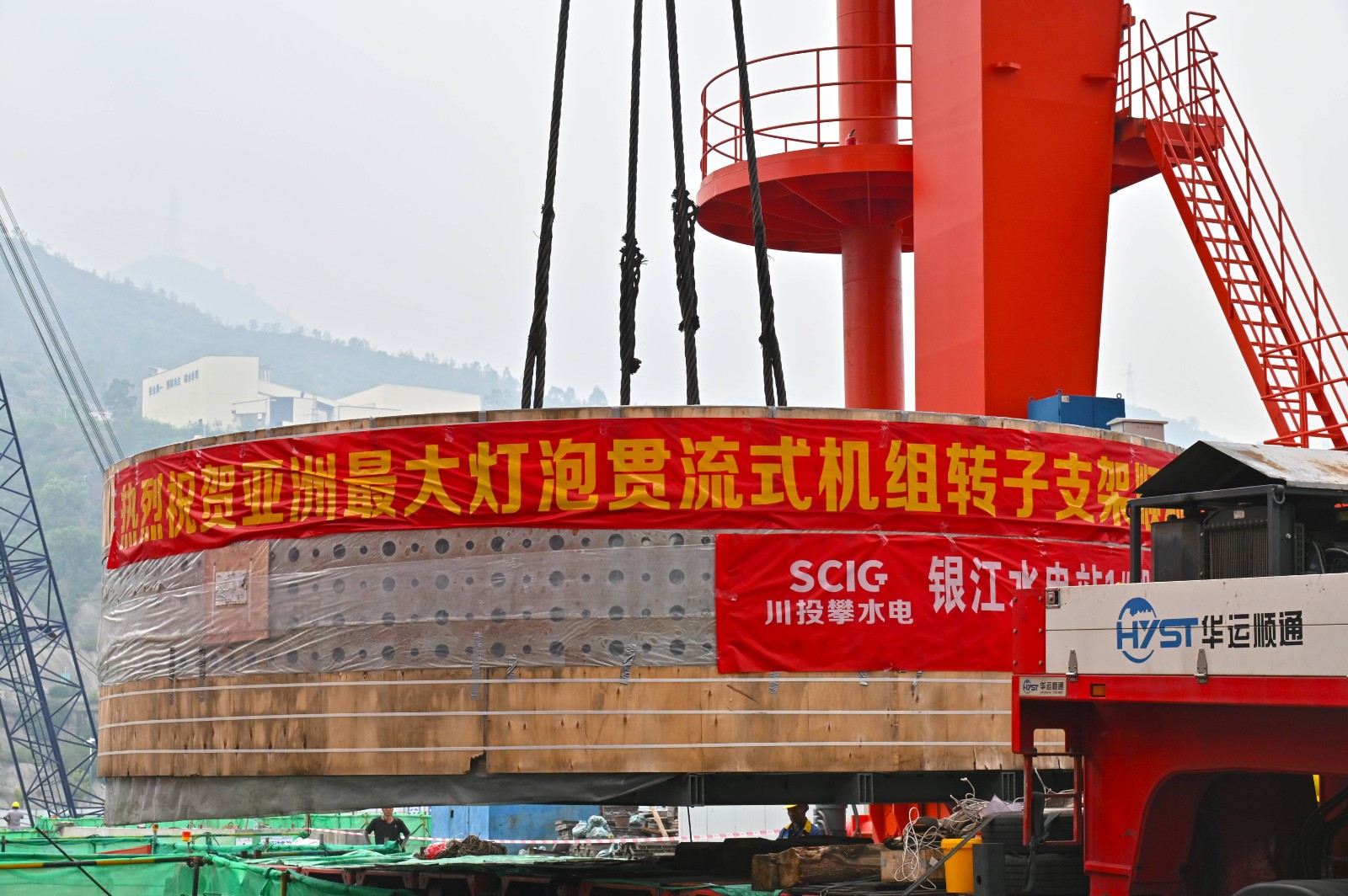 当日上午,攀水电公司和参建单位职工齐聚坝顶,配合迎接历经艰难、远道而来的“主要成员”。据攀水电公司相关认真人先容,该转子支架具有装备重大、运输难题、作用主要三个特征。装备之“重”。转子支架直径达8米,高2米有余,重达百余吨,是现在亚洲最大的灯胆贯流式机组转子支架。运输之“难”。转子支架于4月22日从江苏镇江码头最先运输,先搭船再坐车,途中战胜了大件超宽超限、一连降雨、蹊径塌方等诸多倒运因素,多次调解运输蹊径,风雨无阻,日夜兼程,历时66天,跨越7个省份,全程3062公里,在沿途交警的护送下清静抵达。作用之“要”。转子支架作为机组的焦点部件,为磁轭一体圆盘式结构,中心体接纳整圆锻钢与磁轭圈焊接组成,对转子磁轭笔直度、磁轭圆度等加工精度要求极高,决议着机组的运行性能、运行效率和清静稳固性。