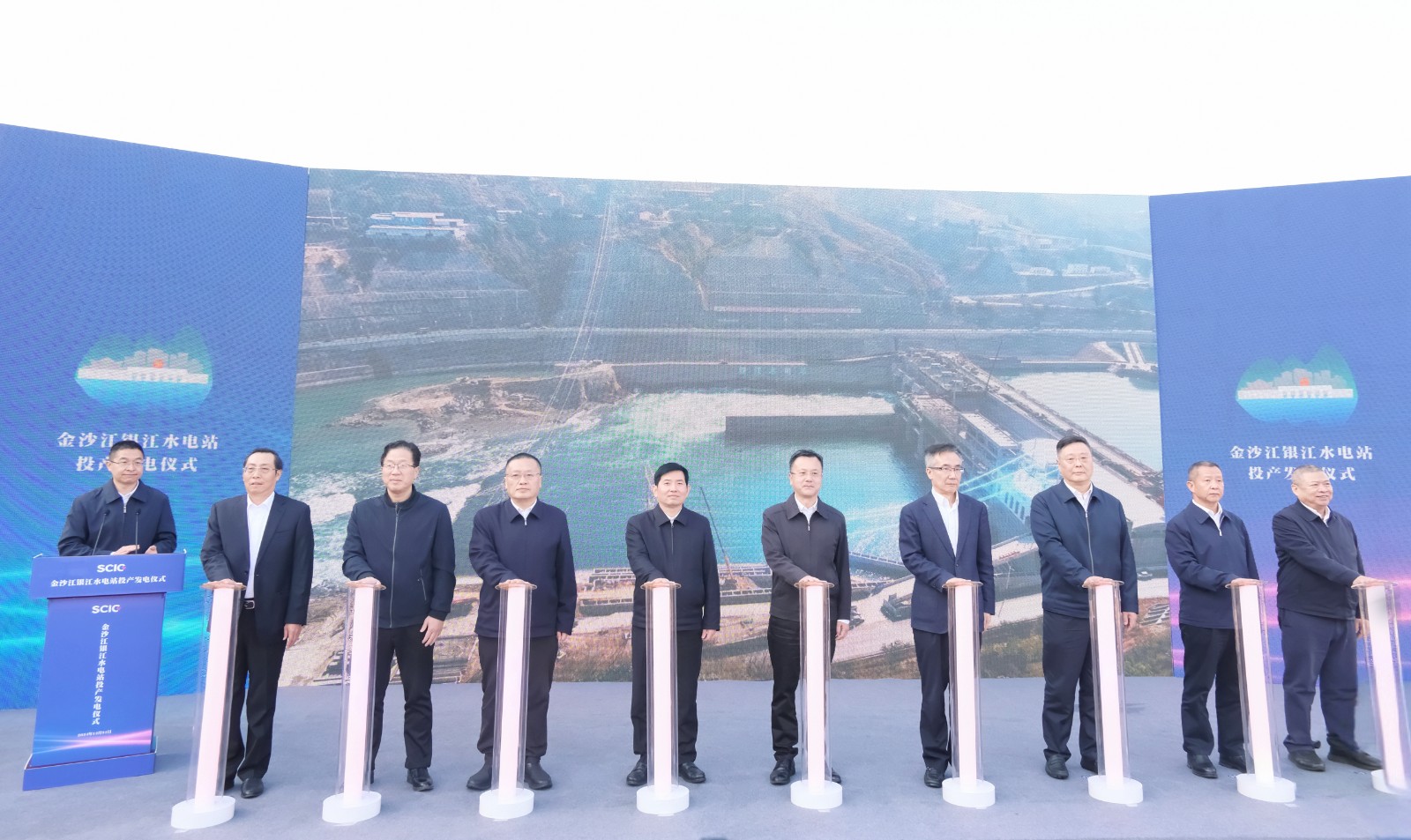 上午9时许,随着仪式现场下达首台机组开机发电指令,吴群刚、吴晓曦、范继跃、李文志、林开国、李仁杰等向导按下启动柱,配合启动金沙江银江水电站投产发电,标记着该水电站提前一年实现投产发电目的。