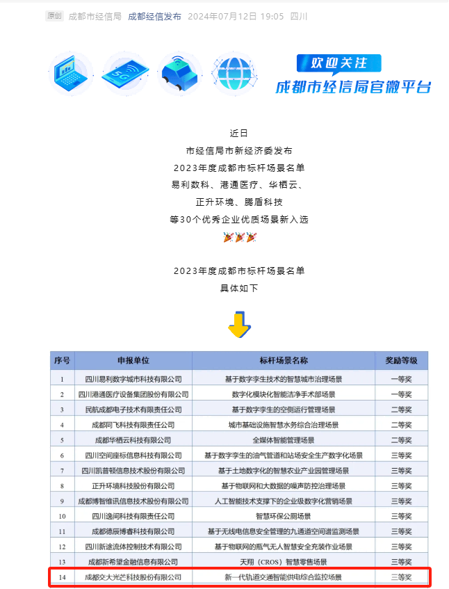 ¿ËÈÕ£¬³É¶¼»á¾­ÐžÖÊÐо­¼ÃίÐû²¼2023Äê¶È³É¶¼»á±ê¸Ë³¡¾°Ãûµ¥£¬½»´ó¹âÏßÐÂÒ»´ú¹ìµÀ½»Í¨ÖÇÄܹ©µç×ÛºÏ¼à¿Ø³¡¾°ÈÙ»ñÈýµÈ½± ¡£