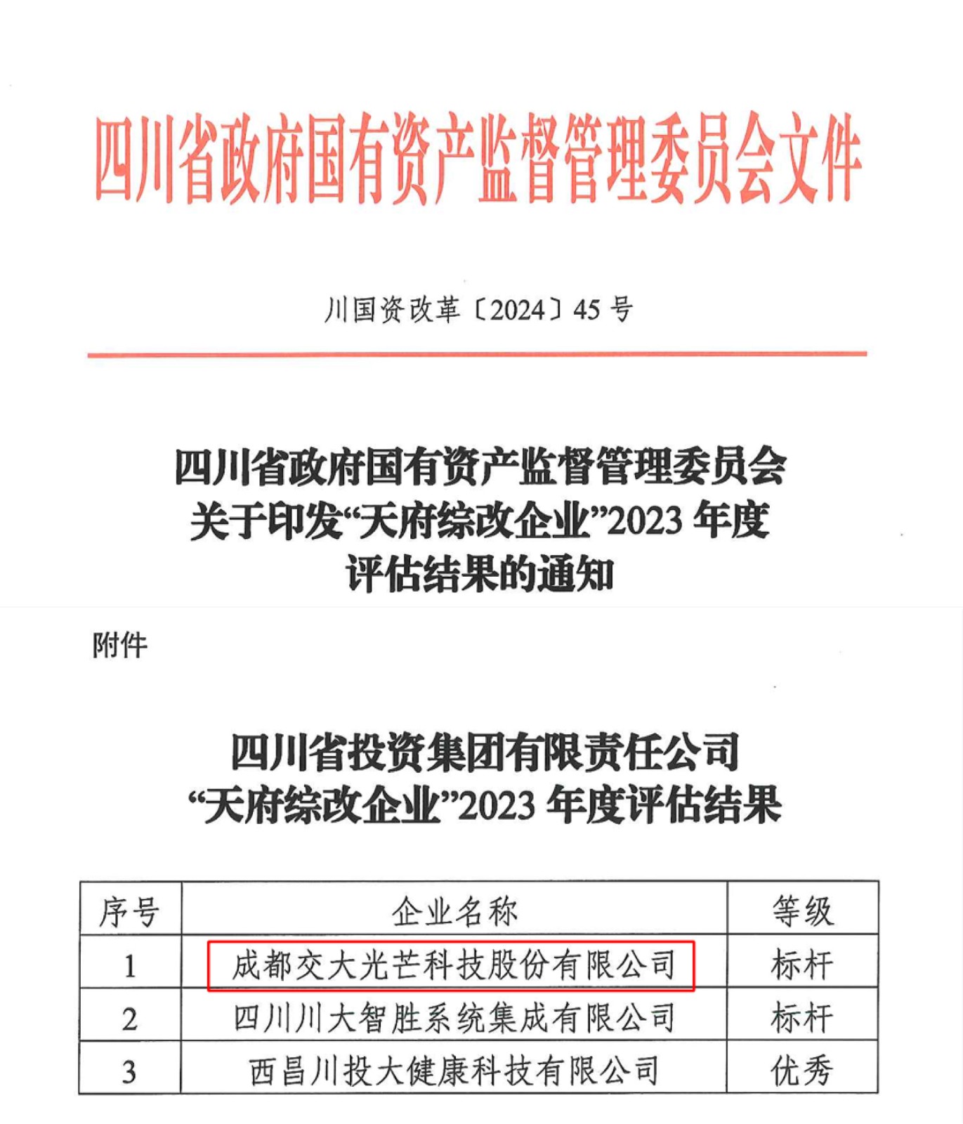 ¿ËÈÕ £¬ËÄ´¨Ê¡¹ú×Êίӡ·¢¡°Ì츮×Û¸ÄÆóÒµ¡±2023Äê¶ÈÆÀ¹ÀЧ¹û £¬½»´ó¹âÏß±»ÆÀΪA¼¶£¨±ê¸Ë£©¡£´Ë´ÎÆÀ¹ÀÓÉÊ¡¹ú×ÊίԼÇë×ÔÁ¦µÚÈý·½»ú¹¹¾ÙÐÐ £¬97»§¡°Ì츮×Û¸ÄÆóÒµ¡±Öб»ÆÀΪA¼¶£¨±ê¸Ë£©µÄ¹²22»§¡£